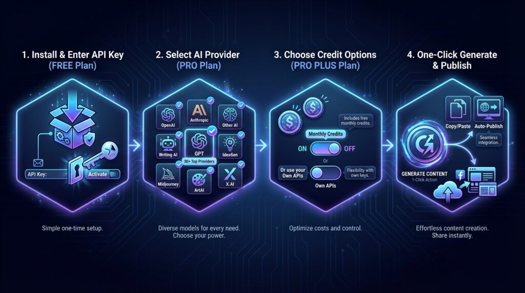 Supercharge your WordPress site with automatic AI-powered content and image generation. Unlimited generation with your own API keys or free monthly credits in PRO PLUS plans.